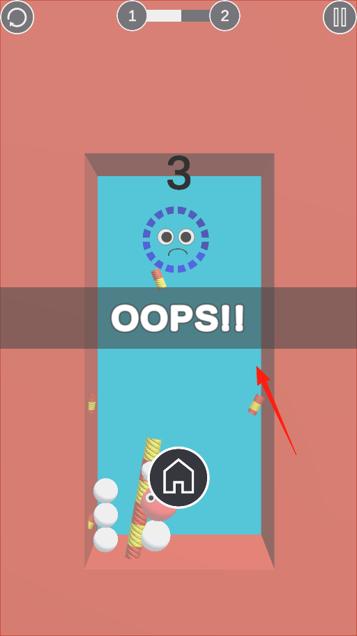 3、游戏失败场景中,角色因角度调整不当未通过通道,点击房子图标返回主页,或重新尝试调整角度,借助失败反馈机制,总结角度调整问题,重新规划拉伸方式。