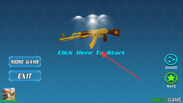 1、游戏启动界面中,点击Click Here To Start按钮进入游戏,开启射击游戏之旅。