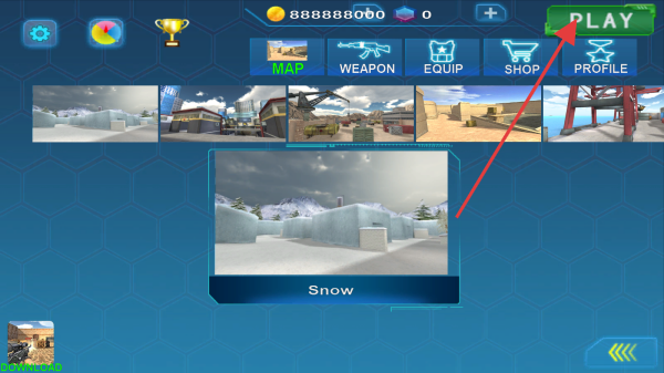 2、在游戏准备界面,点击PLAY按钮进入游戏地图,可提前熟悉MAP、WEAPON等功能选项进行准备。