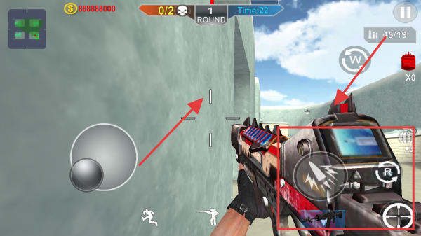 3、进入游戏对战场景,利用左侧移动摇杆控制角色移动,右侧按键进行射击、换弹等操作,注意上方时间和剩余敌人数量。