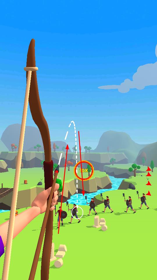 1、操控弓箭击退敌人:控制角色拉弓射箭,瞄准前方靠近的敌人精准射击,将其击退或消灭,防止敌人近身攻击,需根据敌人数量与位置调整射击节奏,确保自身安全。