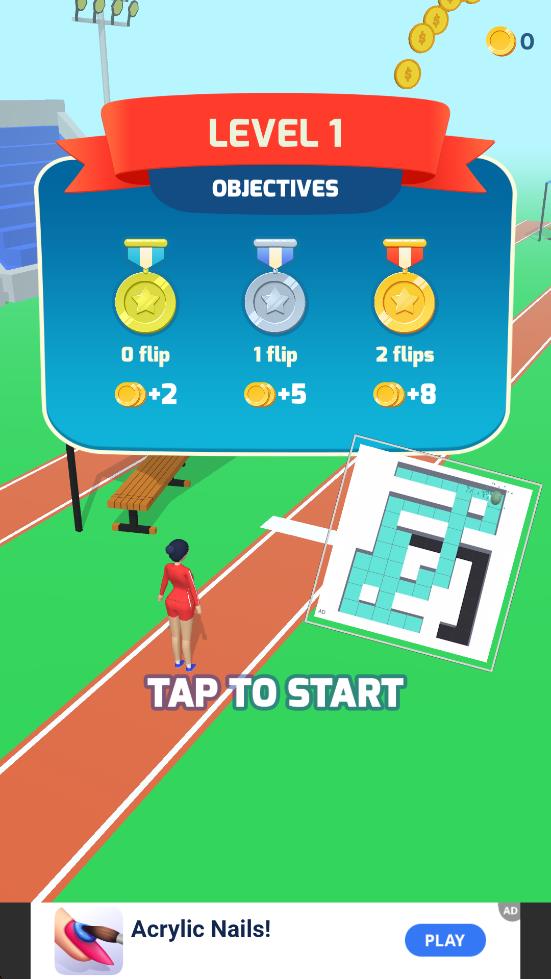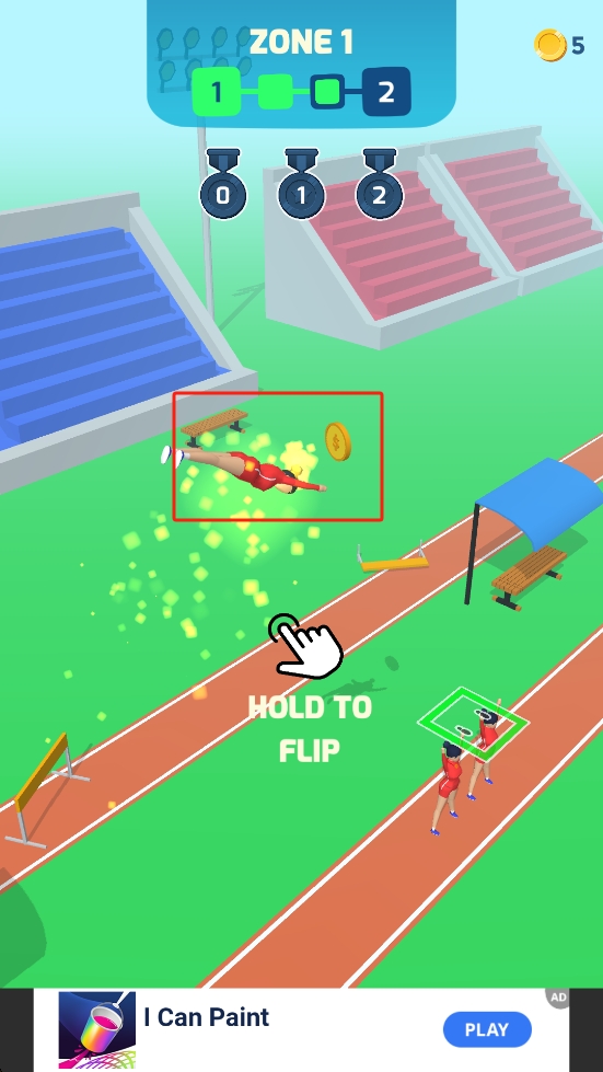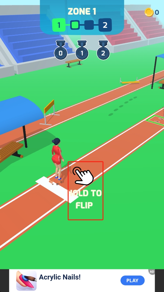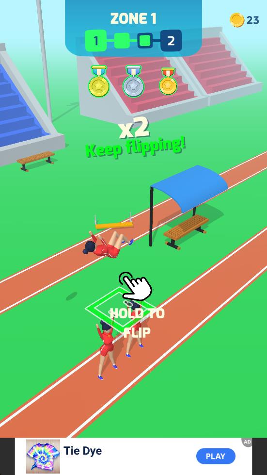 1、在跑道起始位置,长按屏幕上标注的HOLD TO FLIP的区域,触发角色起跑并开启空翻动作,启动比赛。