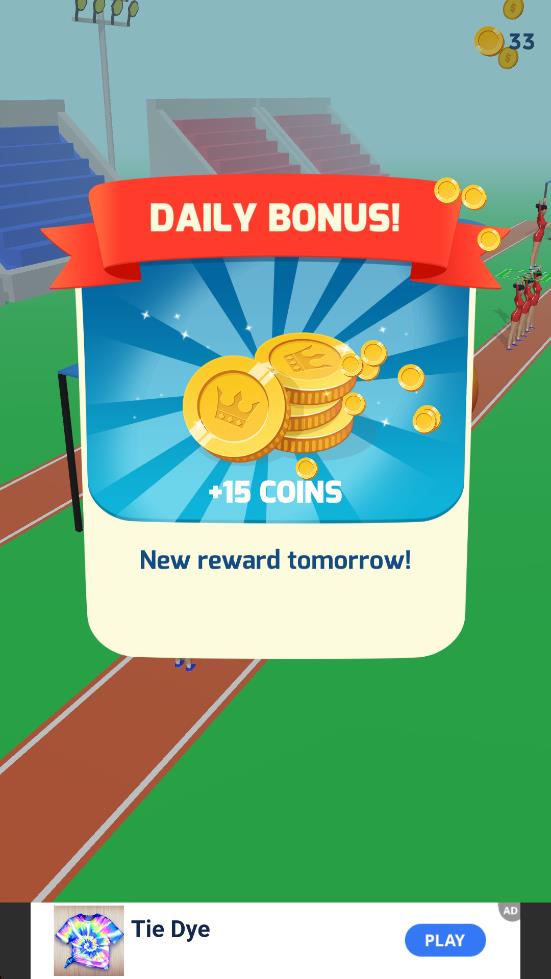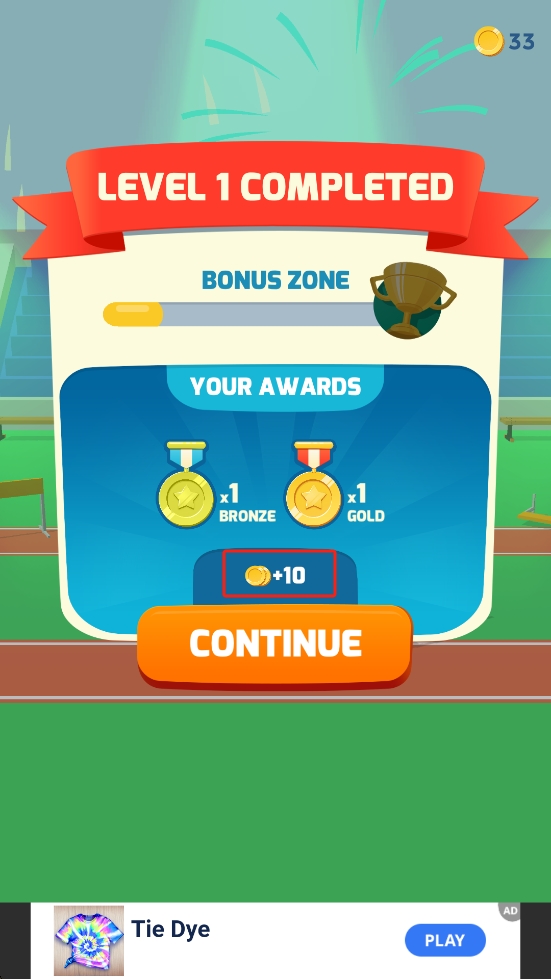 3、到达终点后可获得金币奖牌等奖励,这里我们点击橙色CONTINUE按钮,即可进入下一轮赛事。