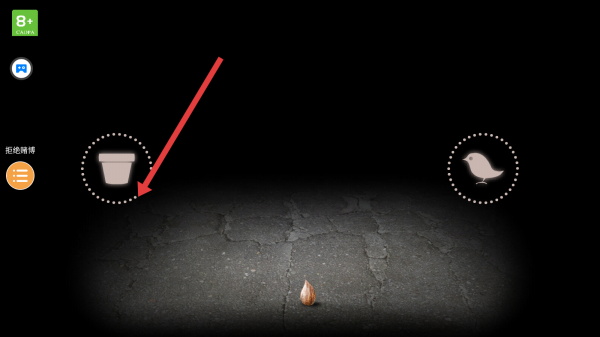 1、游戏初始,点击左侧带虚线框的花盆图标,将地面种子移入花盆,触发种植流程,开启植物养成。