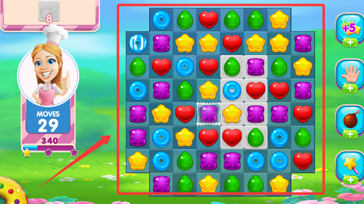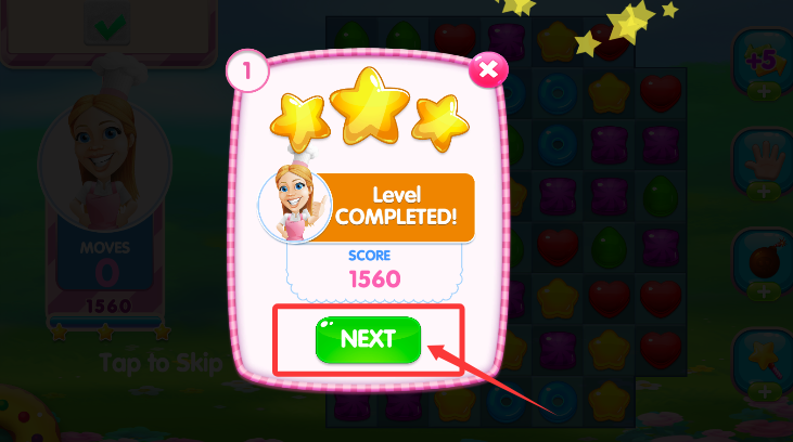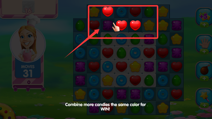 2、移动相邻的同类糖果使其排列成行,完成三消或更多连击。