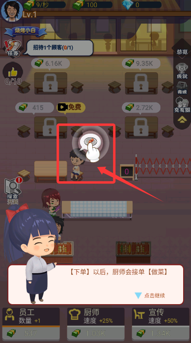 1、轻触顾客订单气泡,自动传送需求至厨房,大厨随即开始烹饪料理。