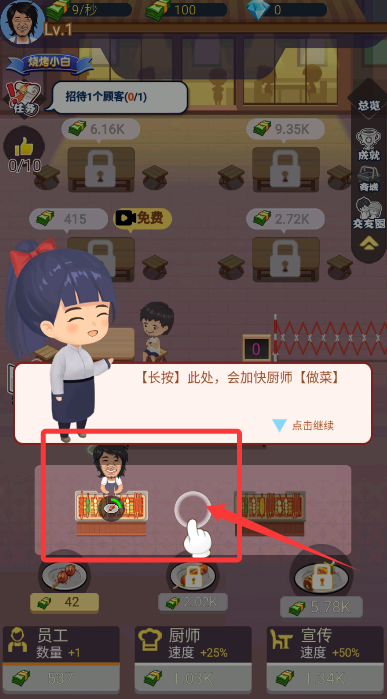2、按住灶台区域不放,激发厨师潜能,显著缩短菜肴制作时长。