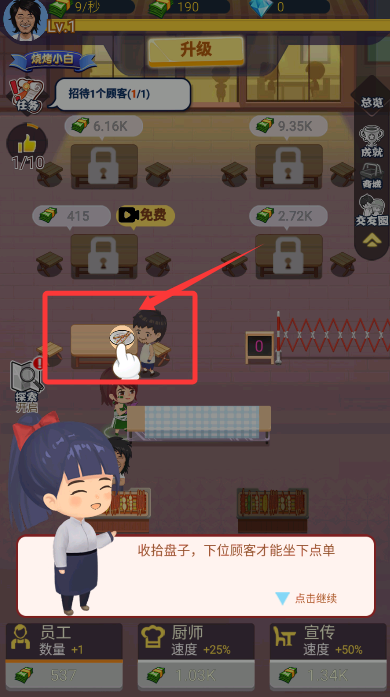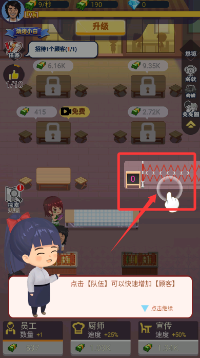 3、人才招募模块,可以雇佣不同特性的助手,有的擅长快速翻烤,有的精于招呼客人,组建完美团队能让经营事半功倍。