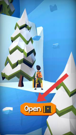 2、画面中有个背着登山包的玩家,场景是雪地和树木,下方有个橙色按钮,上面写着Open,点击该按钮可开启相应物品或功能。