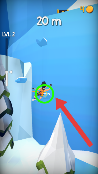 3、目前处于关卡2,已攀登20米,获得4枚金币,根据绿色圆圈的指引,引导玩家进行相关操作。