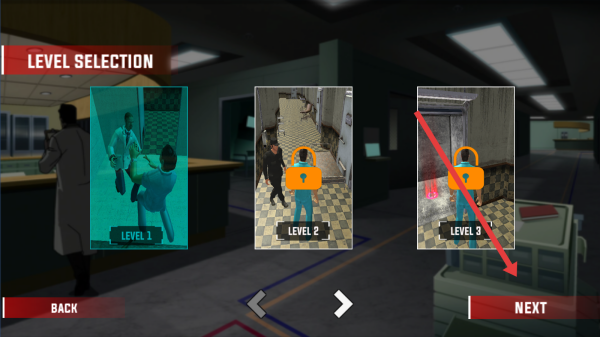 2、在关卡选择界面,按照提示选择关卡LEVEL-1后点击NEXT,准备进入对应逃脱挑战关卡。