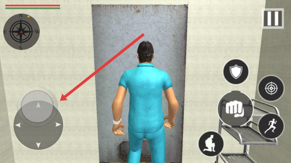 3、可以滑动屏幕中的操控虚拟摇杆,移动角色靠近门,尝试互动,寻找逃脱线索,推进游戏进程。