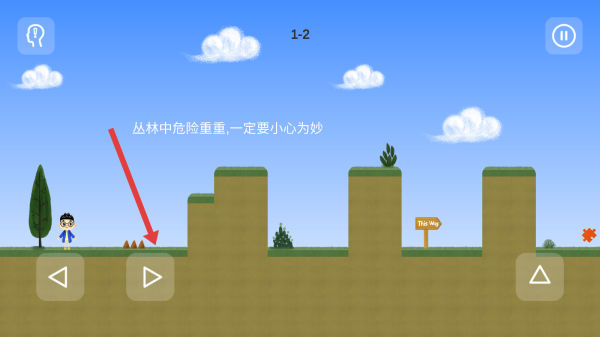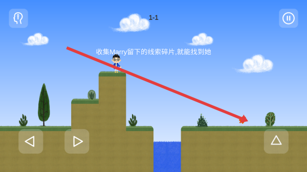 2、来到关卡1-1,用左右键移动,遇沟壑点右下角来进行跳跃,过去沟壑收集橙色线索碎片,推进找Mary的任务。