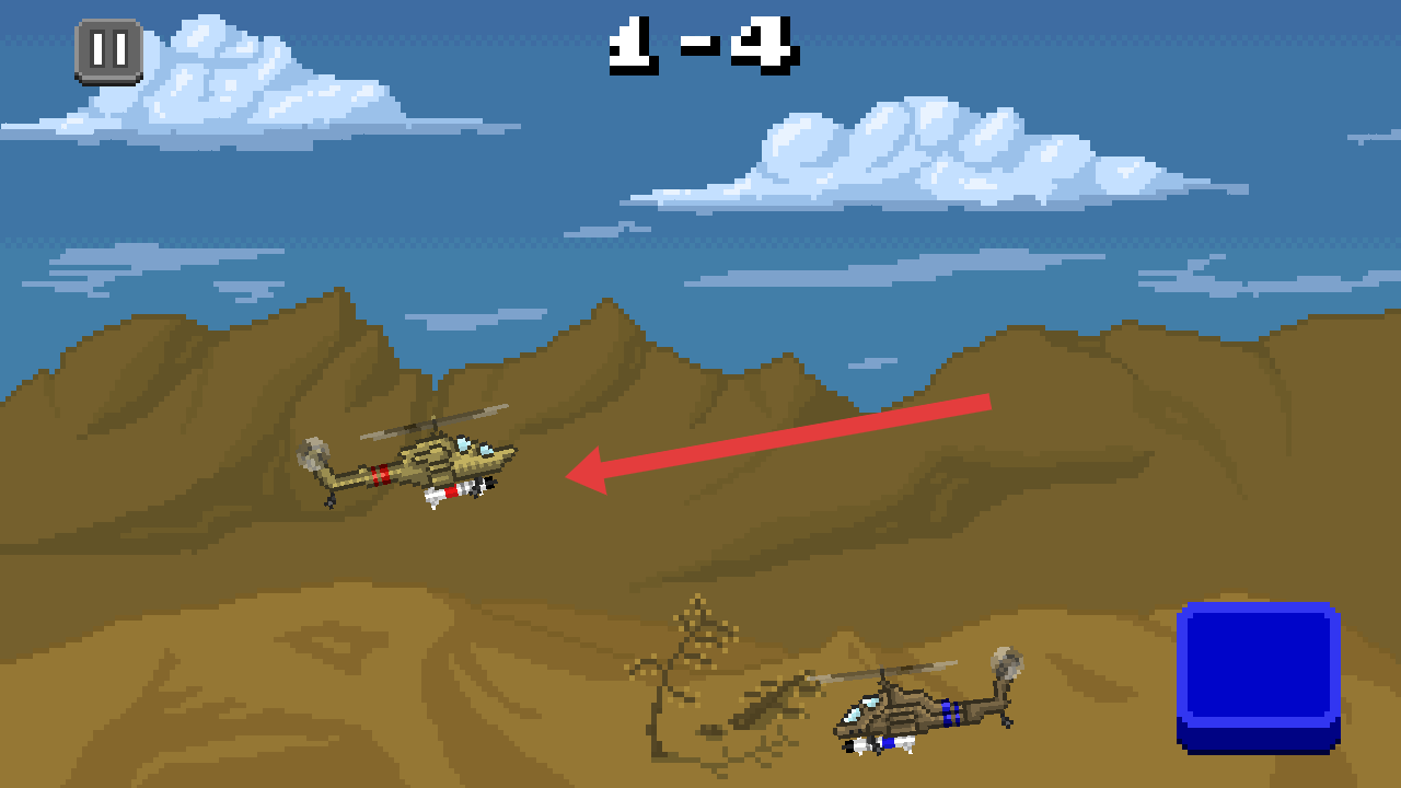 1、像素风格怀旧:采用复古的像素画面,直升机造型与战斗场景充满怀旧元素,像素特效搭配经典画风,让视觉体验兼具复古与独特,为对战增添别样氛围。