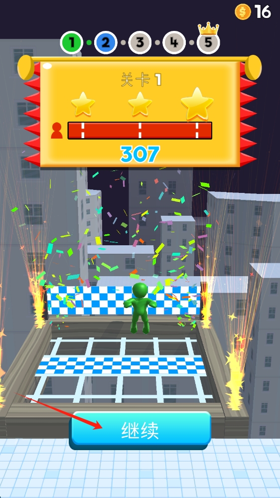 3、成功抵达终点后,点击继续,进入下一关,挑战更复杂屋顶场景与敌人布局,点击继续。