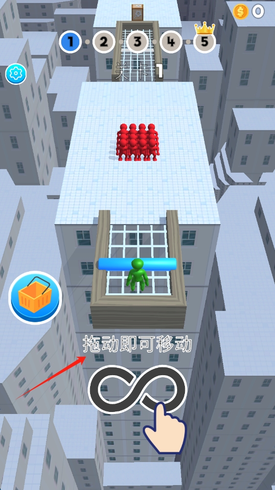 1、进入屋顶跑酷关卡,拖动屏幕控制绿色角色移动,避开红色敌人,收集道具,滑动开始游戏。