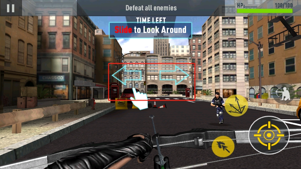 1、进入作品后我们先滑动屏幕调整视角,扫视城市街道搜寻敌人,借助建筑与路障规划射击方位,为攻击提前布局。