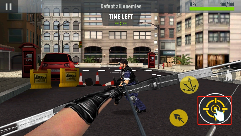 2、根据提示锁定前方敌人,点击右侧瞄准射击按键,操控弩箭精准命中目标,迅速消灭敌人推进任务。