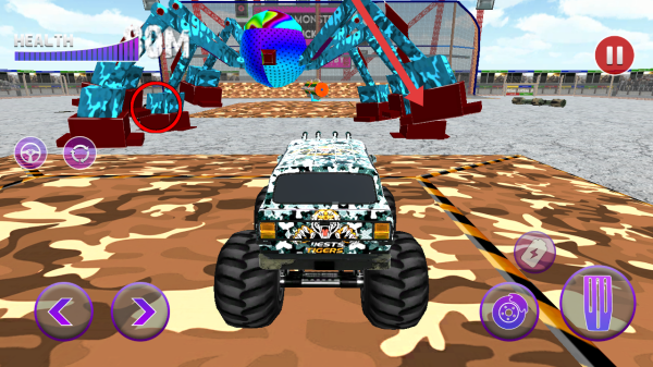 1、进入游戏后,驾驶自己的怪物卡车在场景寻找敌方卡车的踪迹,要记得躲避周围机关。