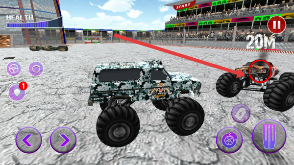 3、操控己方怪物卡车,与敌方卡车展开对抗,借助界面的按键进行竞技,时刻注意双方的血量。