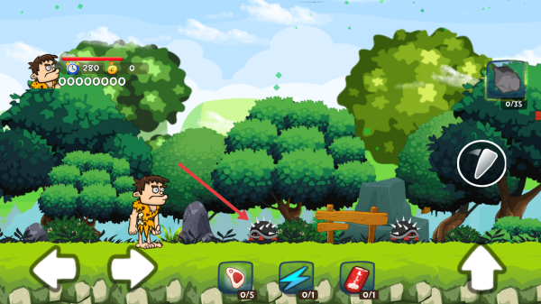 1、点击游戏标题界面中武器上的红色按钮,进入Caveman Hero游戏主流程开启冒险。