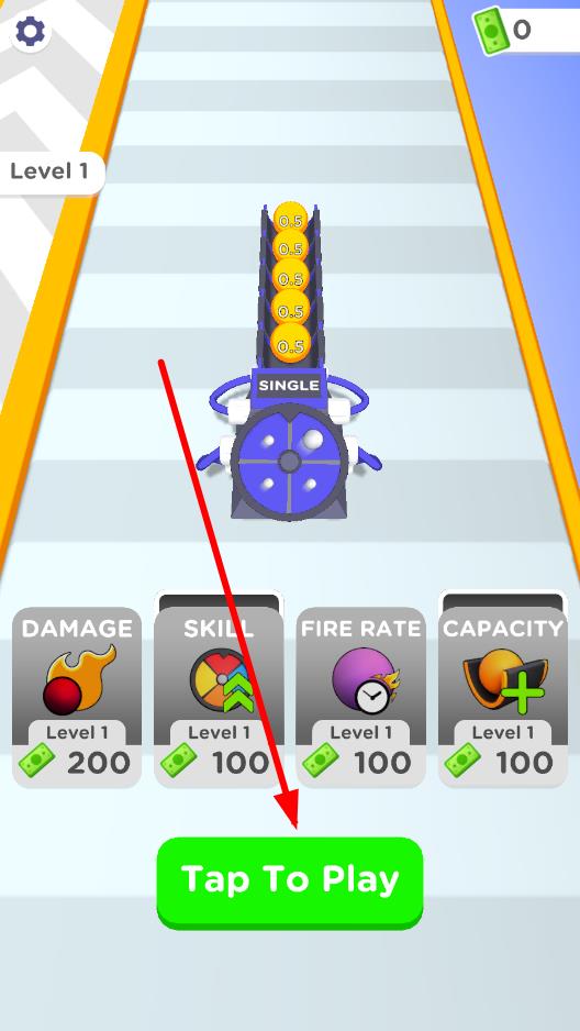 1、进入Level1的游戏界面,点击醒目的“Tap To Play”开始挑战,操控炮台沿赛道前进,灵活躲避绿色方块等各类障碍。