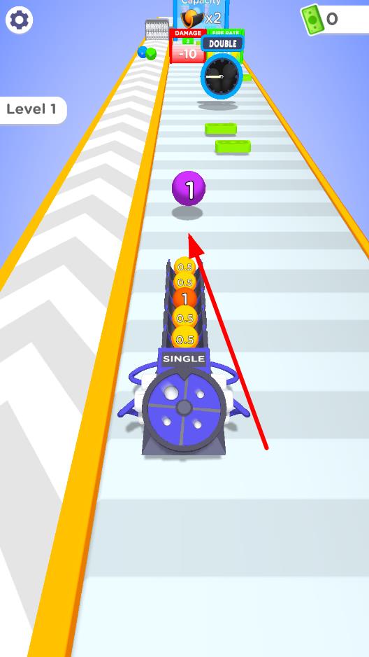 2、跑酷过程中主动收集带数字标识的黄色小球填充弹药,遇到紫色大球等目标时及时射击,凭借冲击力击碎障碍推进关卡进度。
