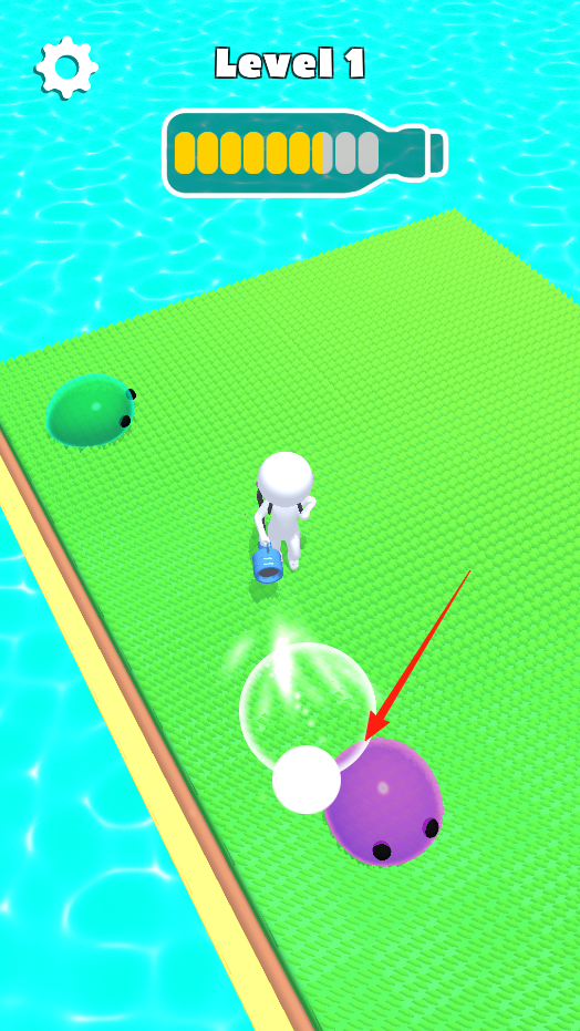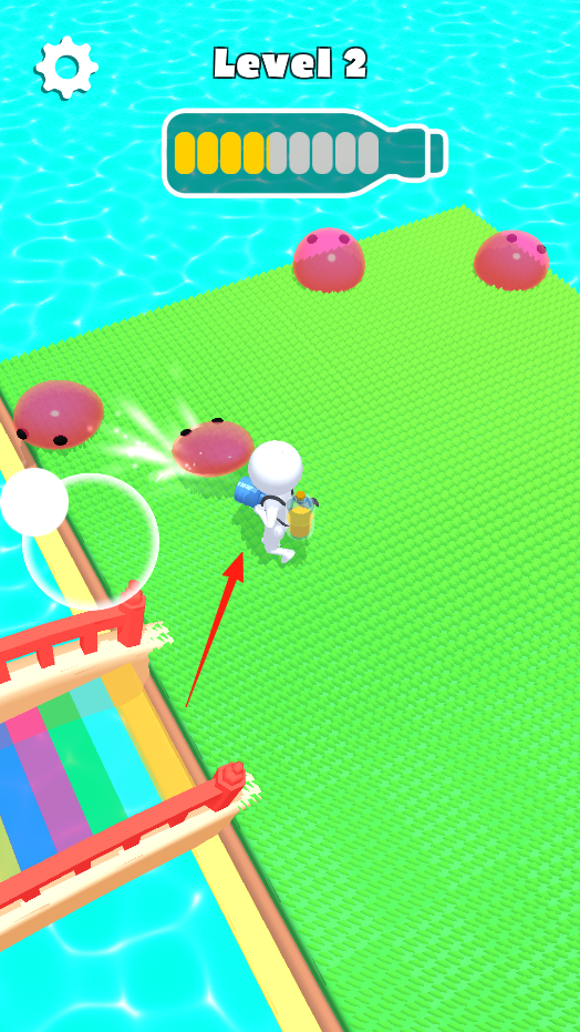 3、进入Level2场景,角色携带喷雾面对粉色球体,操控角色移动,靠近球体后释放喷雾,处理球体并补充喷雾瓶能量,利用关卡进阶机制,体验难度提升的清理玩法。