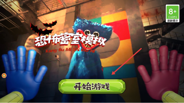 1、点击游戏初始界面绿色开始游戏按钮,进入恐怖密室模拟冒险,留意8+适龄提示。