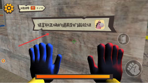 2、根据墙面提示请拿取正确的道具至门前验证,在场景搜寻对应道具,推进任务。