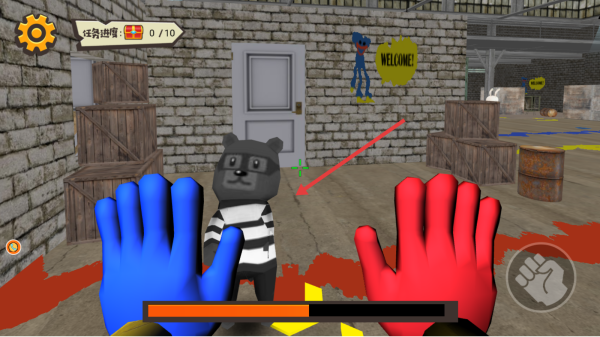 3、遇到箭头指向的黑熊角色,注意交互方式,结合任务进度0/10,探索场景解锁新内容。