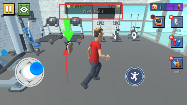 3、游戏进行中,依据找到所有孩子任务提示,利用摇杆和视角操作,在场景中寻找孩子完成任务。