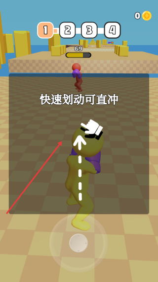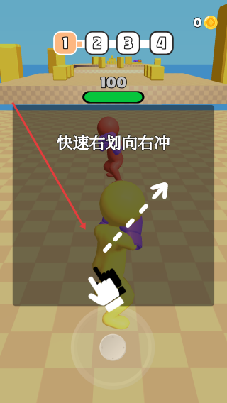 1、游戏开局按提示快速右划屏幕,让角色向右冲刺,借助操作超越对手推进关卡。