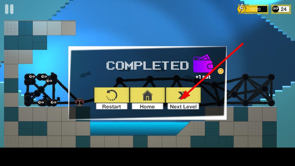 3、成功让黑球生物抵达关卡出口,触发“COMPLETED”结算界面,点击“Next Level”进入下一关,持续闯关解锁更高难度内容即达成目标。