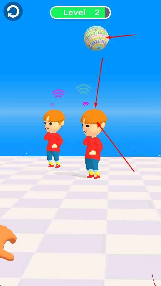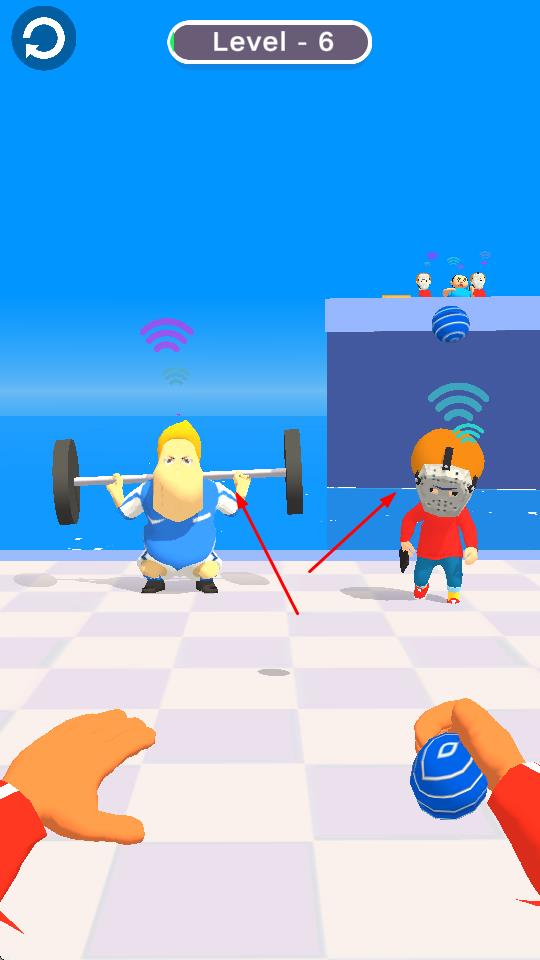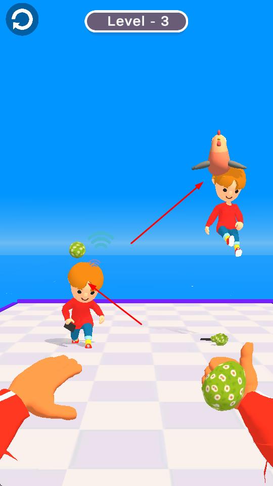 1、进入游戏后,通过点击或滑动屏幕,操控手中的球,将其投掷到带有信号标识的角色头上。