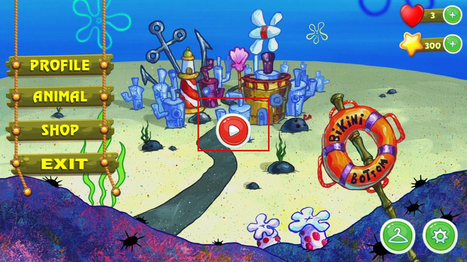 1、进入游戏界面点击中央红色播放按钮,开启海绵宝宝在比奇堡的冒险之旅,踏入充满童趣的海底世界。