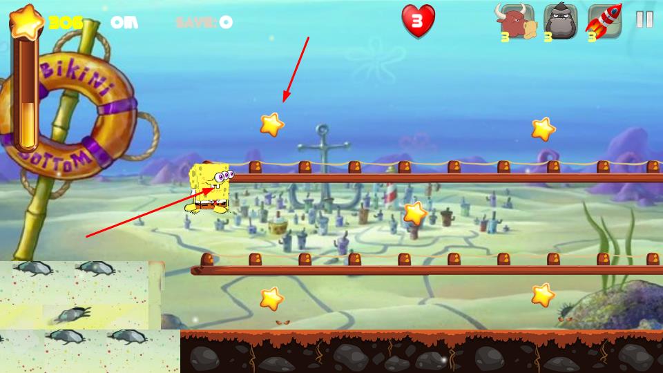 2、在冒险场操控海绵宝宝左右移动、跳跃,收集沿途金色星星,留意避开障碍物,跨越复杂地形。