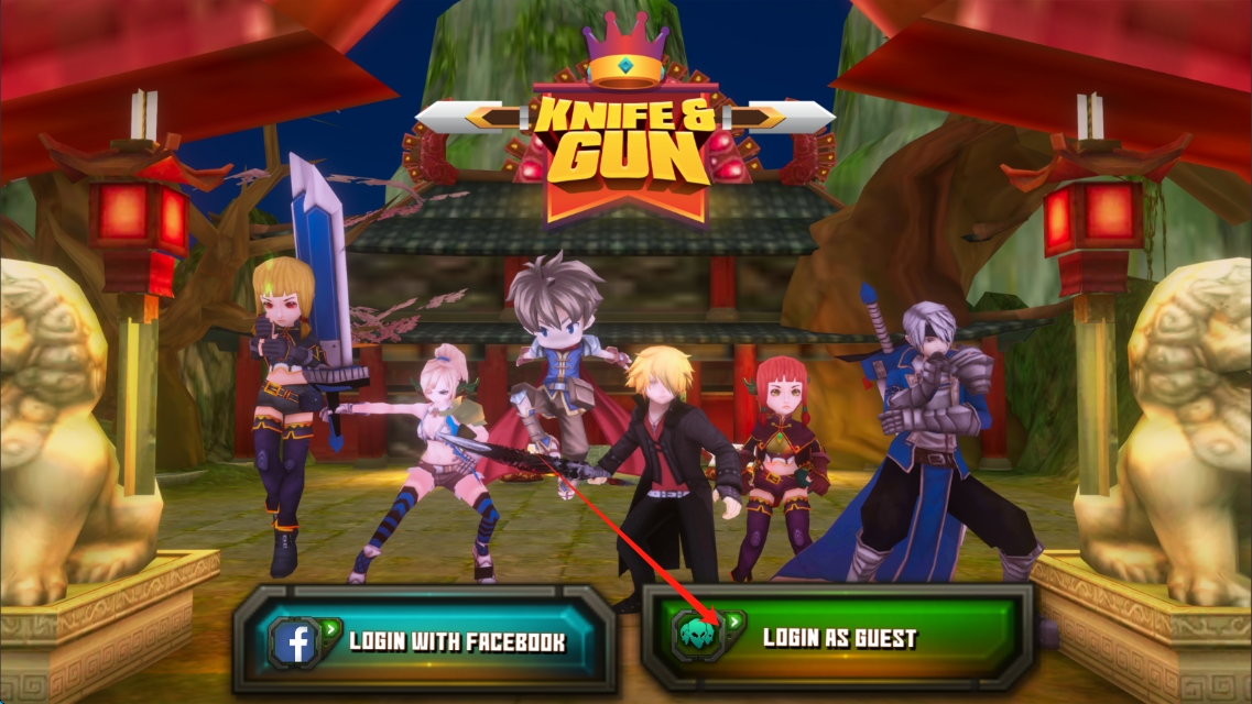 1、打开Knife&Gun,选择登录方式,游客登录快速体验,脸书登录同步数据,点击开始游戏。