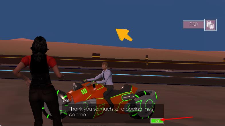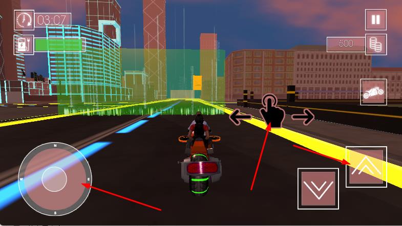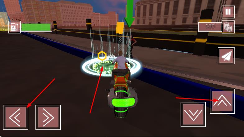 2、通过屏幕两侧方向按钮或虚拟摇杆控制飞车方向,驶向绿色光柱标记的目标点,途中留意金币收集。