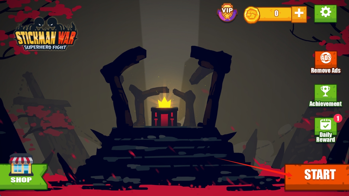 1、进入Stickman War,点击START,选择英雄,开启火柴人格斗冒险,点击开始游戏。