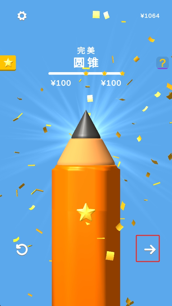 3、待铅笔呈现完美圆锥笔尖后,我们点击界面右下角的白色箭头按钮,进入下一轮切削关卡。