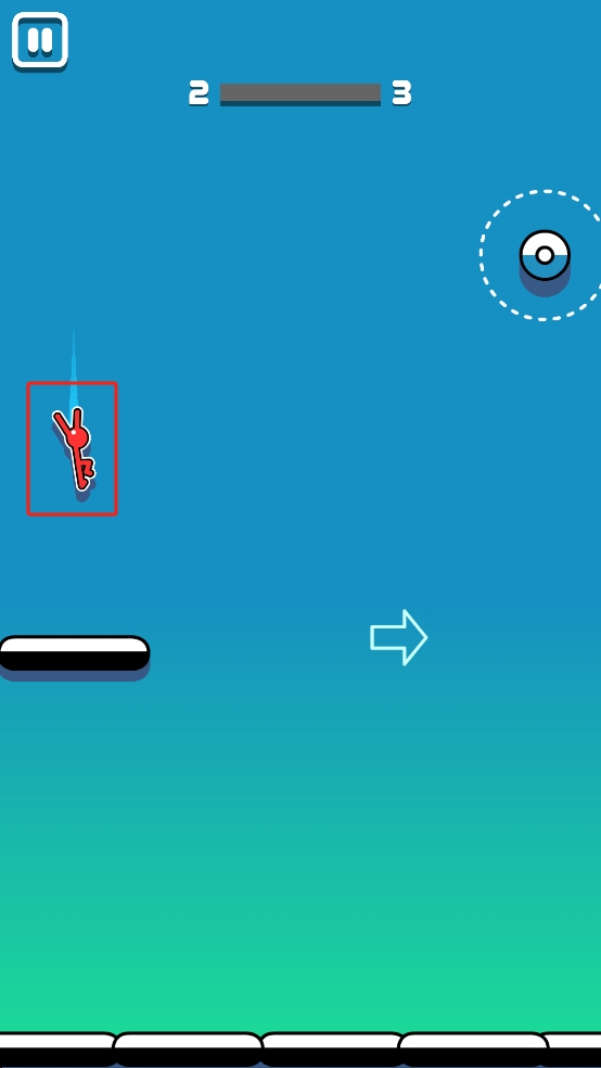 1、操控红色火柴人,紧盯右上方虚线圆环区域,点击屏幕发射钩子,借助钩子勾住目标产生的拉力,启动角色的移动进程。