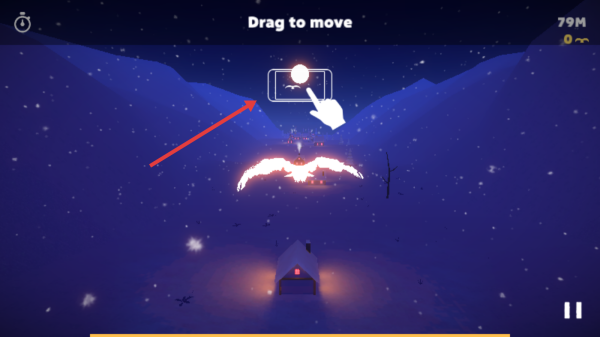 3、跟随红色箭头指引,让飞行物飞向目标区域,穿越雪地,完成关卡推进任务。