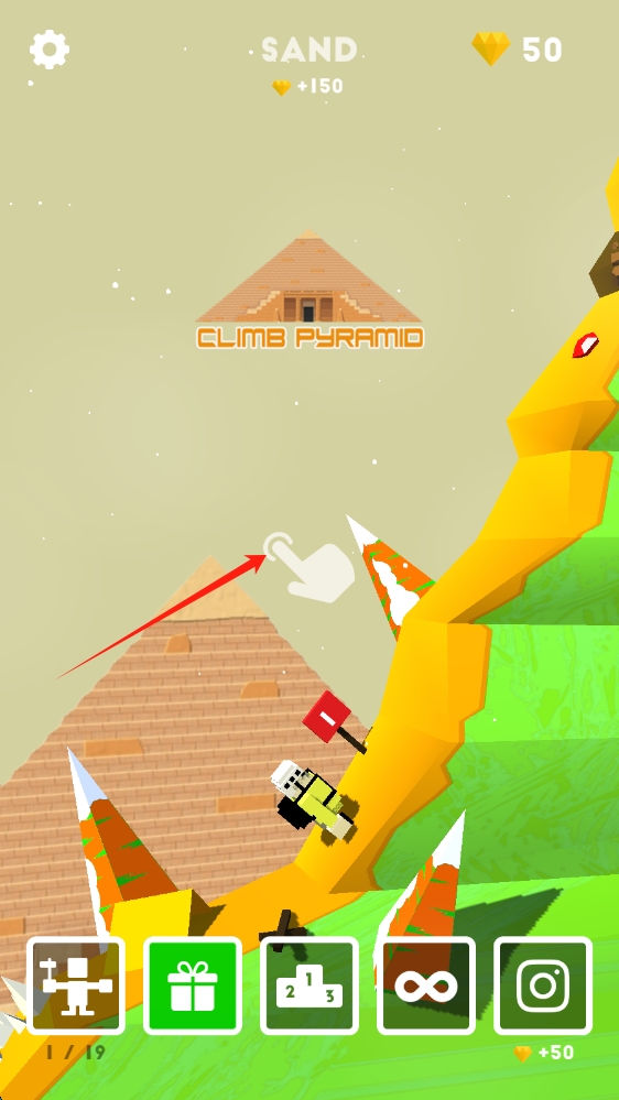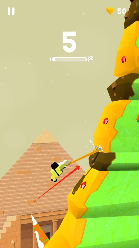 1、进入Climb Pyramid,点击屏幕发射钩子,抓住山体,开始金字塔攀爬挑战,点击开始游戏。