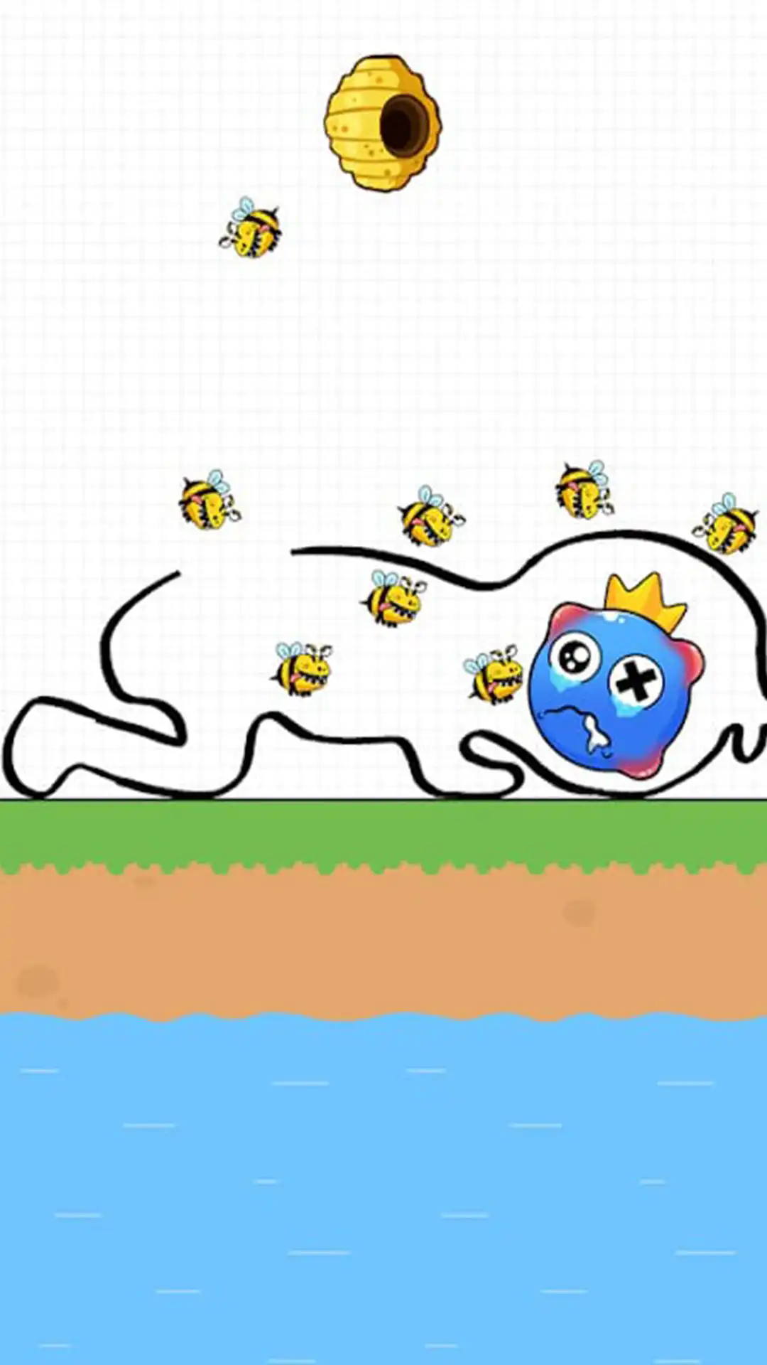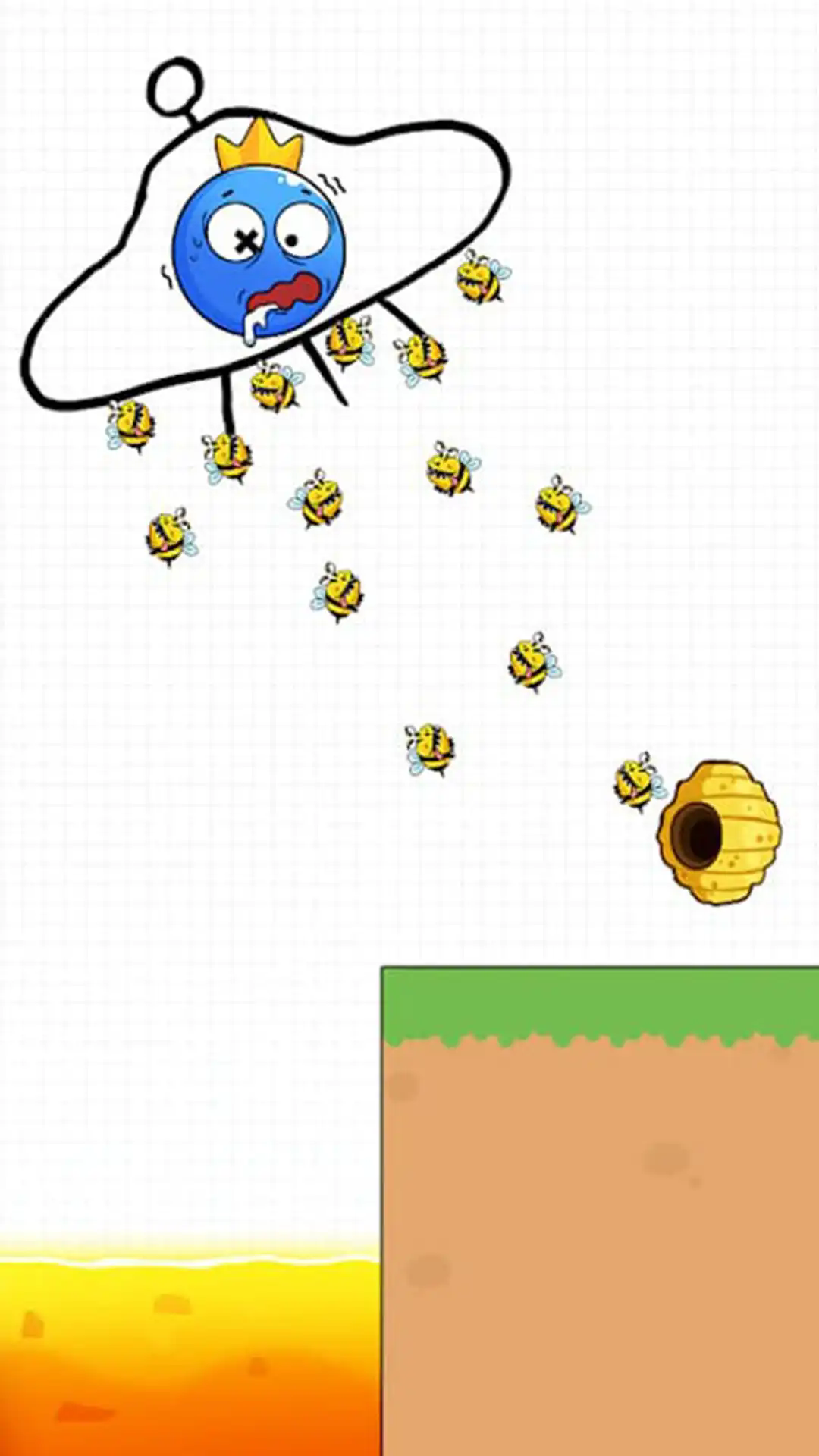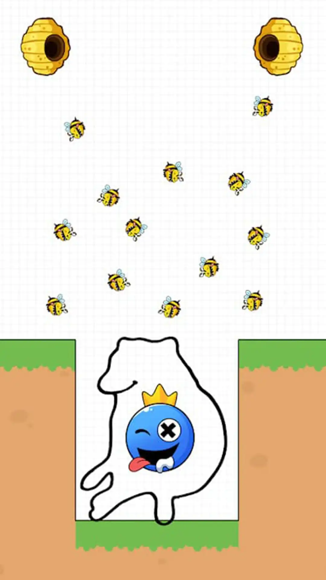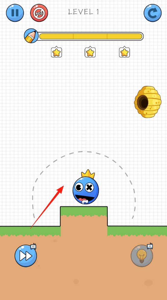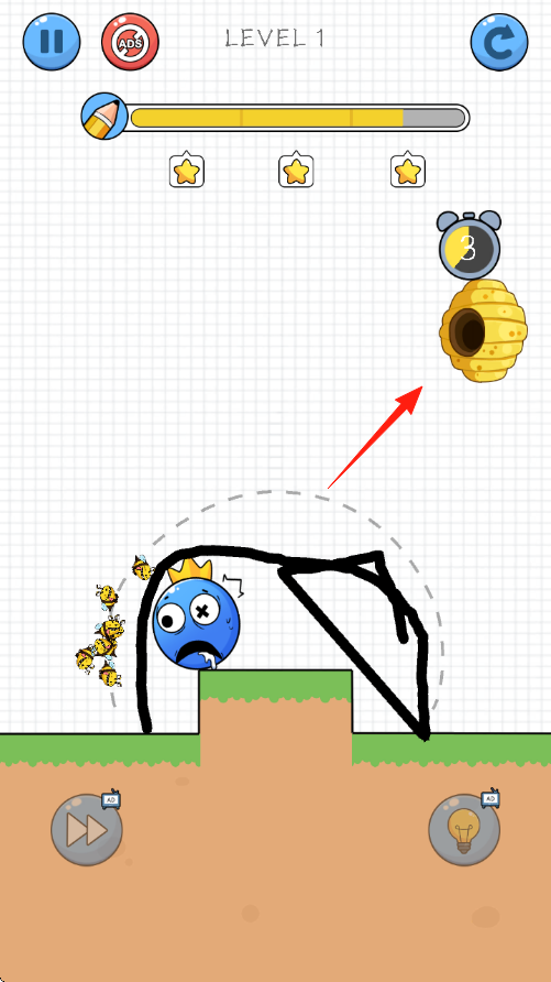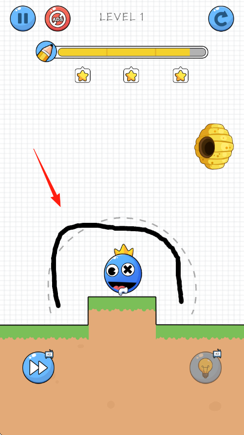 1、进入关卡LEVEL1,看蓝色小球位置、移动轨迹虚线,留意蜂窝等目标障碍,准备画线。