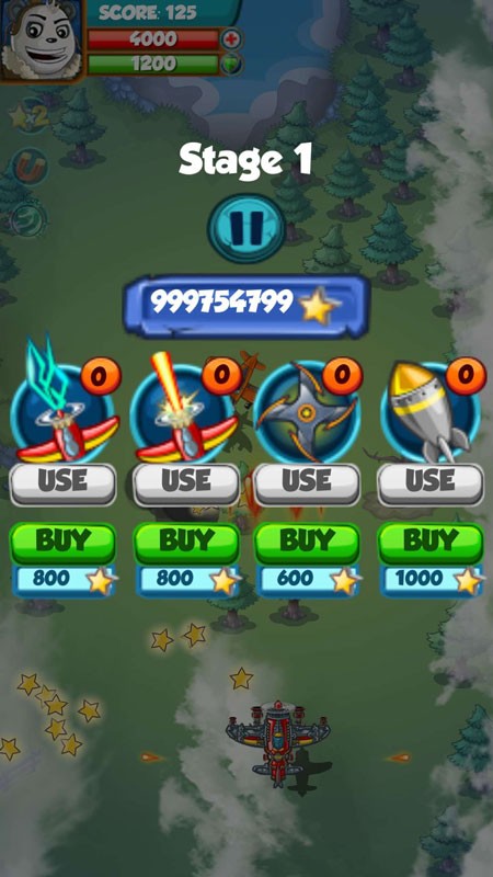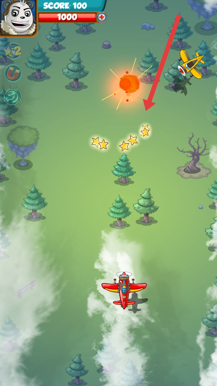 1、操控红色战机飞行,收集空中闪烁的星星,积累分数,星星是需要击败敌机才能获得的。