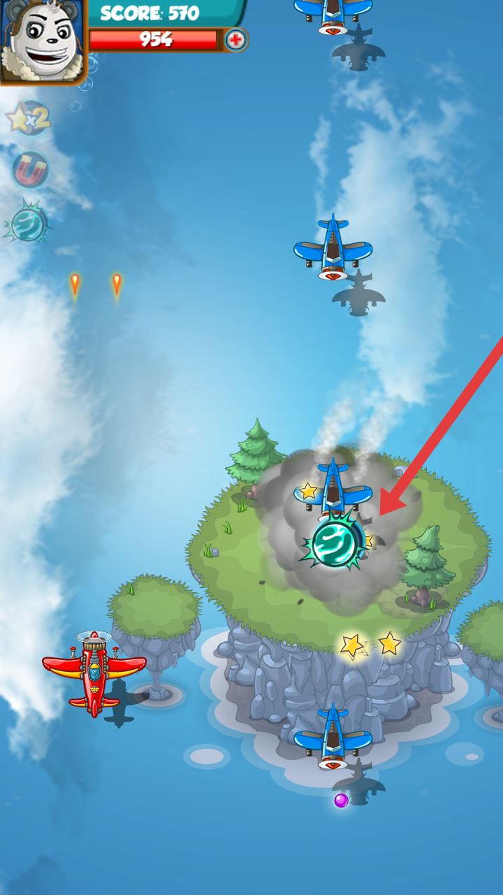 3、靠近岛屿时,需要拾取蓝色战机旁的绿色旋转道具,激活强力攻击,助力快速清扫岛上敌机。
