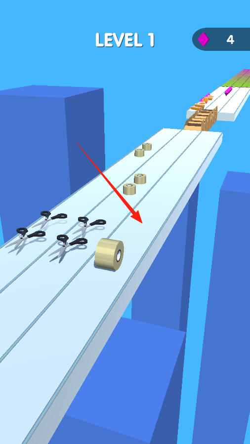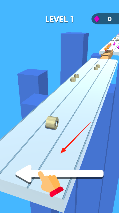 1、进入Level1,操控胶带卷在跑道移动,手指滑动屏幕,改变胶带卷方向,避开障碍收集道具,通过滑动操作,开启跑酷挑战,感受道具收集的互动乐趣。