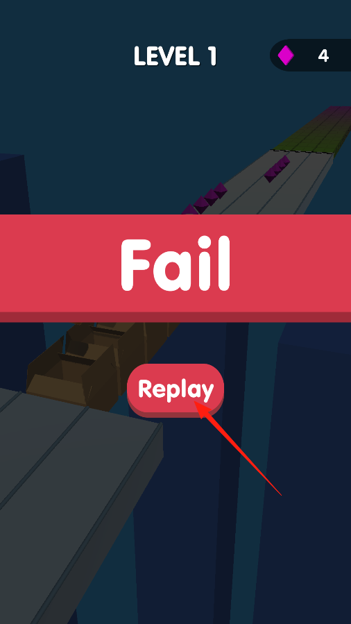 3、挑战失败后,进入Fail界面,点击Replay按钮,重启Level1,借助失败重玩机制,调整操作策略,通过再次尝试,体验反复挑战通关的玩法,持续突破自我。