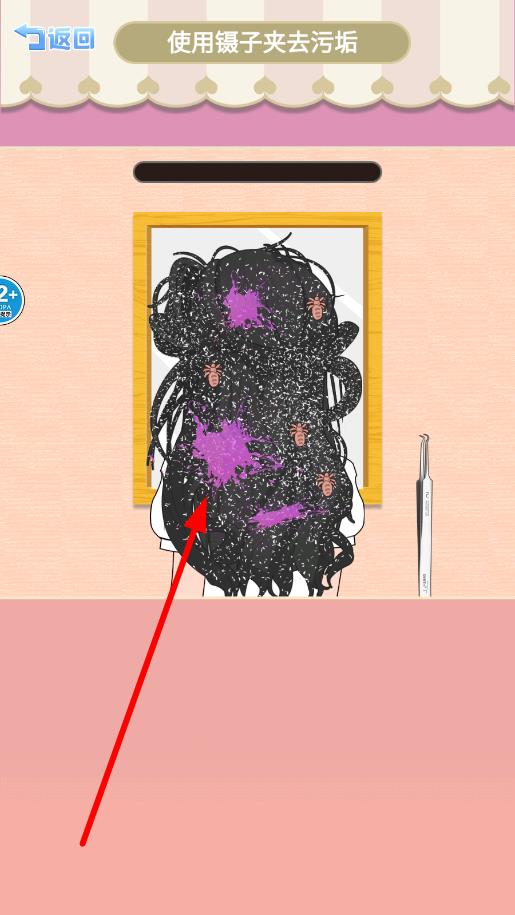 2、在清理环节,依据提示,用镊子工具点击头发上的污垢区域,精准夹取,逐步清洁,让头发恢复洁净。
